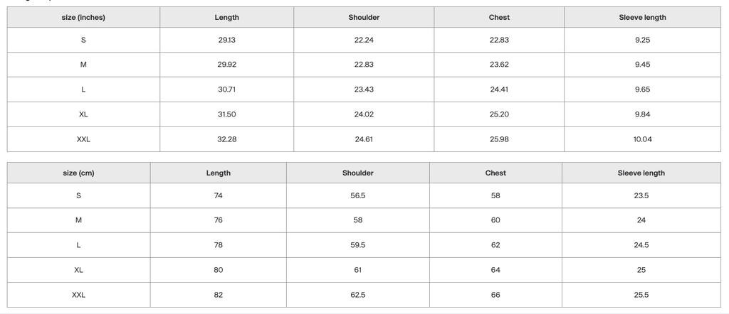 | Sleeve length | 9.3 | 23.5 | 9.4 | 24 | 9.6 | 24.5 | 9.8 | 25 | 10.0 | 25.5 |